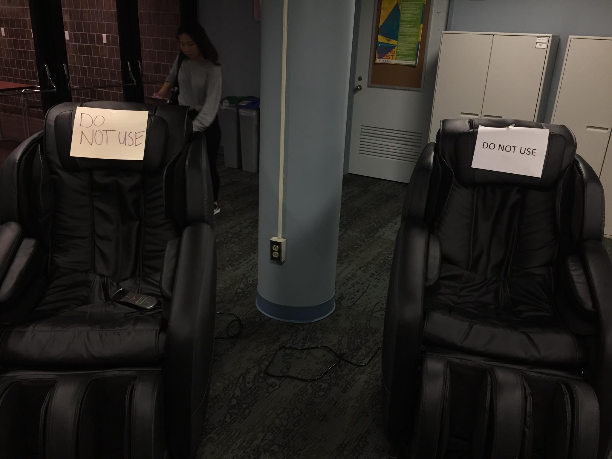 Broken massage chairs found in Ruth Merrill.