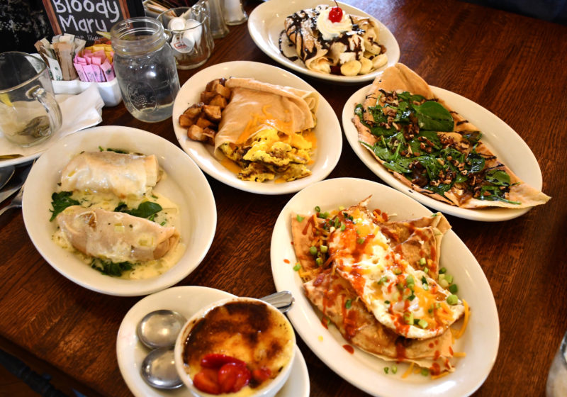 This week’s brunch features crepes — provided by Simply Crepes. Simply Crepes has a cute and inviting interior. It’s super cozy with warm tones, wood tables, high ceilings, exposed wood beams, and mini chandeliers that add a touch of class. I’ll decree it country-glam.
