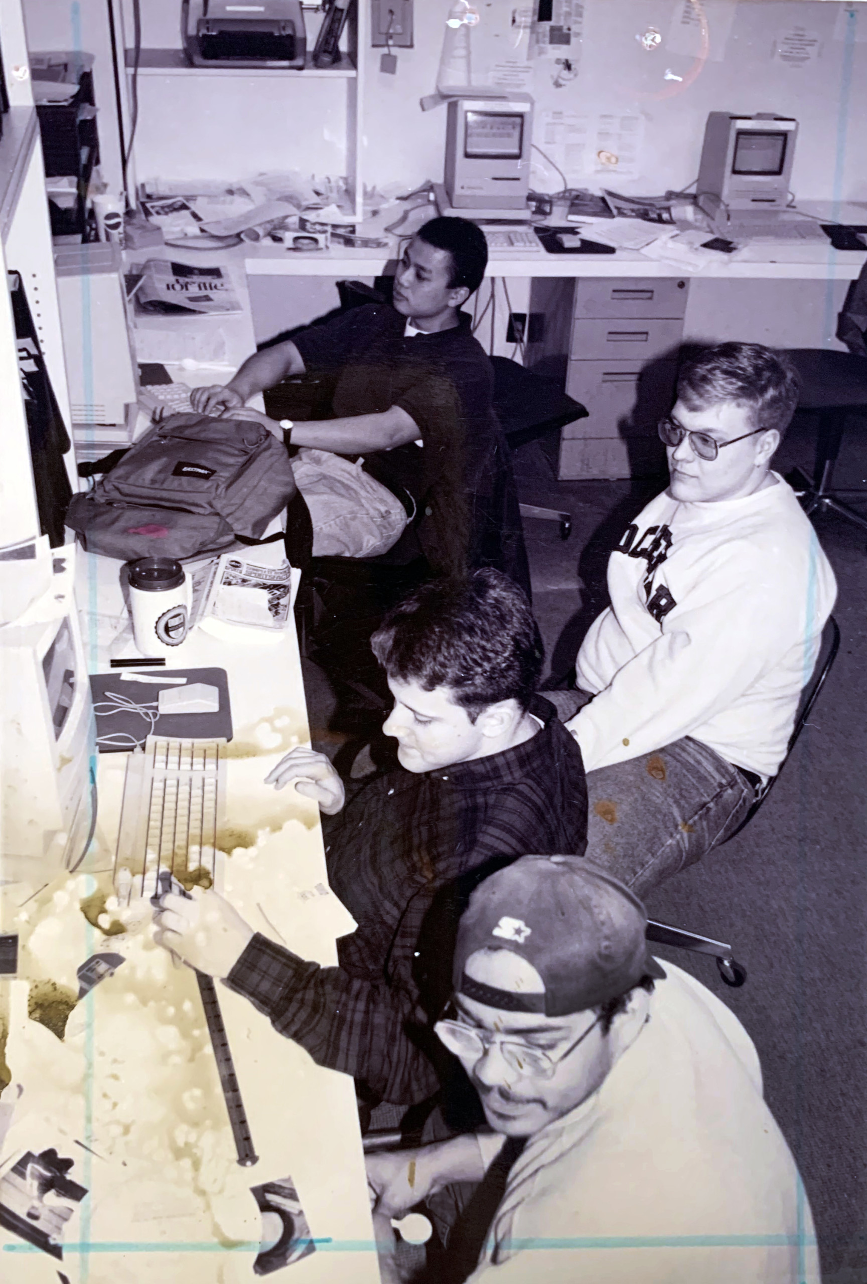 Photo by Allegra Boverman. Campus Times staff photo. From front to back, the sports desk at Campus Times: Miguel Rodriguez, Brian Liss, Erik Thingvoll and Jeff Tran.