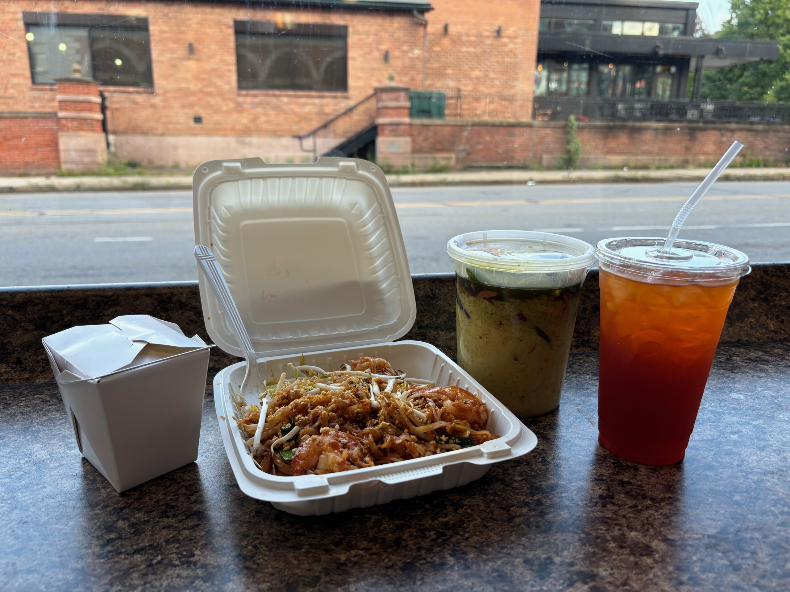 My friend snagged the pad thai with shrimp at spice level two, which was lacking in number of shrimp but high in volume. There’s plenty of chew and crunch in the noodles, crushed peanuts, and bean sprouts, and the heaviness of the dish is lightened up by the chives and the sauce, which is mildly zingy and not overly thick. Drinks-wise, I snagged a Thai iced tea with lemon, which split the difference between the toasty warmth of Thai tea and the citrusy refreshing quality of an iced tea perfectly.