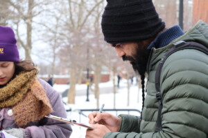 An attendee signs in on a clipboard to express support for graduate student unionization.