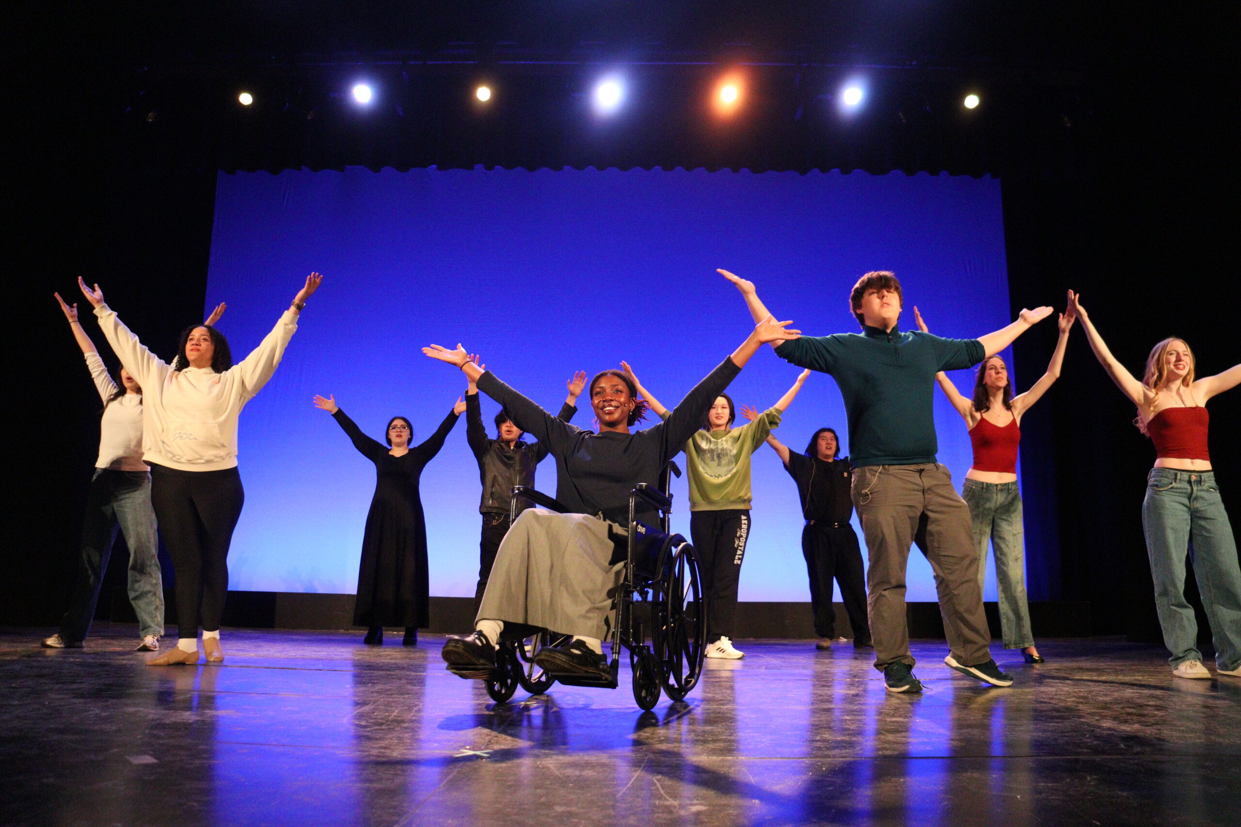 The cast of the OBOC show posing under the stage lights.